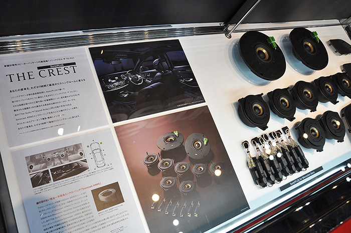 設(shè)置在「甜美空間」外壁的展柜中展示著聲麗創(chuàng)音的豐富產(chǎn)品群。有可對(duì)應(yīng)奔馳/寶馬/MINI/奧迪/豐田/斯巴魯6大知名廠家的車種專用揚(yáng)聲器套裝「SonicPLUS」,和被斯巴魯采用為原裝可選揚(yáng)聲器的WRX/LEVORG用「Sonic Design揚(yáng)聲器套裝」等。還配備了揭示產(chǎn)品特性、要點(diǎn)的宣傳板和動(dòng)畫。即便是初次接觸高檔揚(yáng)聲器材的人,通過展示資料和現(xiàn)場職員的演示,也能很容易了解聲麗創(chuàng)音和其產(chǎn)品及聲麗創(chuàng)音對(duì)開創(chuàng)品牌所作的不懈努力。