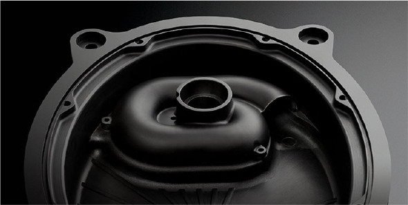SonicPLUS豐田車專用型號(hào)T300系列的前聲場(chǎng)中低音單元,采用了配有新研發(fā)的G字形調(diào)音端口=G調(diào)的第二代鋁混合箱體。這個(gè)G調(diào)除具備低音反射端口的功能外,還可以調(diào)整中低音和降低高音量時(shí)的風(fēng)噪(端口噪音)。根據(jù)G形旋流口的形狀和其功能,命名為G調(diào)?;宓暮蟀氩糠峙c腔室(后殼體)整體模制,前半與擋板部分精密嵌合,這就大大提高了整個(gè)箱體的剛性,因此可以重生延伸到低端,干凈準(zhǔn)確的低音。